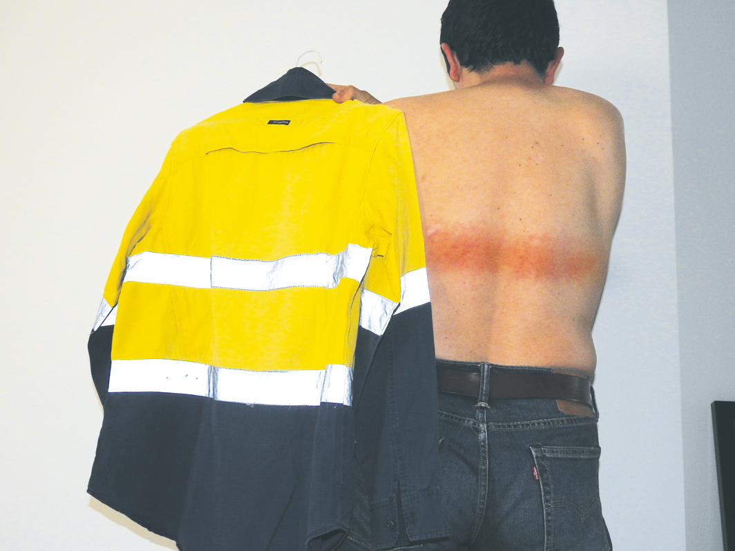 Box – Band‐shaped erythematous rash across the patient's upper back coinciding with the upper retroreflective band on the work shirt