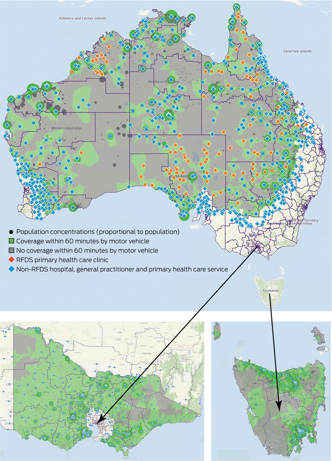 We undertook a cross‐sectional review of prospectively collected routine patient data for older Australians (Indigenous patients aged 55 years or more; non‐Indigenous patients aged 65 years or more4) retrieved by the RFDS from anywhere in Australia between 1 July 2014 and 31 June 2017. To assess population health service coverage, we entered the locations of available health services (source: Health Direct; https://about.healthdirect.gov.au) into the RFDS Service Planning and Operational Tool (SPOT), and then overlaid 2016 census data provided by the Australian Bureau of Statistics. The study was approved by the Australian Capital Territory Health Service Human Research Ethics Committee (reference, 2018/QA/00184).