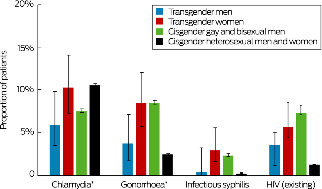 The new: Transgender women attending sexual health clinics in Australia are more likely to have STIs than cisgender heterosexual patients; transgender men are less likely than cisgender gay and bisexual men to have STIs. The prevalence of gonorrhoea among transgender women has risen from 3% to nearly 10% over the past seven years.