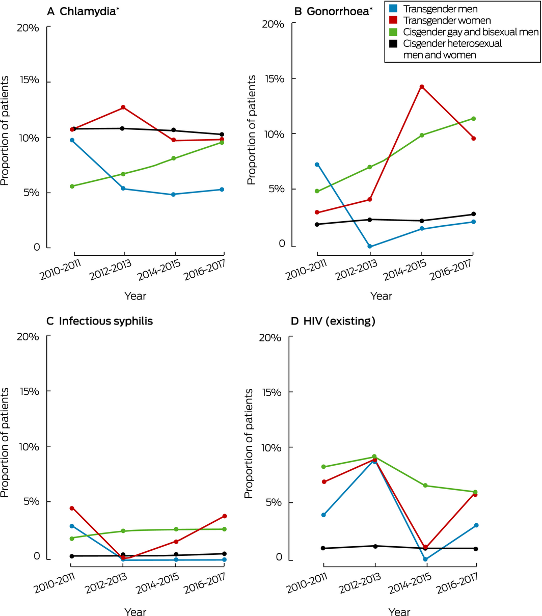 We analysed data for a national sample of transgender people who had attended publicly funded sexual health clinics in Australia. We estimated rates of HIV, chlamydia, gonorrhoea and syphilis infections in transgender men and women, assessed changes in these rates over time, and compared them with rates for cisgender people.