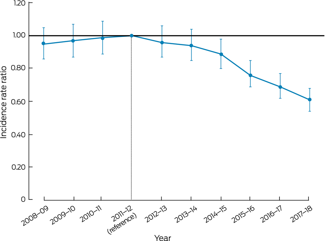 The rate of knee arthroscopies then declined, to 483.5 operations per 100 000 people in 2017–18 (IRR, 0.61; 95% CI, 0.54–0.68). The rates of all procedure types included in our analysis declined from 2011–12; in particular, the rate of arthroscopic meniscectomy procedures (Australian Classification of Health Interventions [ACHI] codes 49560‐03, 49561‐01, 49562‐01) fell by 42%, from 588.0 to 340.1 operations per 100 000 people (IRR, 0.58; 95% CI, 0.51–0.66). In a separate analysis, the rate of arthroscopic meniscus repairs increased by 258% over the same period.
