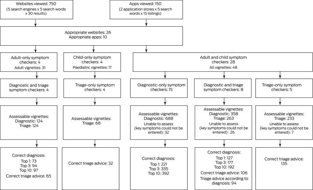 To identify the most prominent free online SCs in Australia, we searched for “symptom checker”, “medical diagnosis”, “health symptom diagnosis”, “symptom”, and “cough fever headache” (ie, flu‐like symptoms) with five popular search engines (Google, Yahoo, Ask, Search Encrypt, Bing) between November 2018 and January 2019. The first three pages of results for each search engine were filtered to identify SCs that were publicly available, in English, for humans, and not restricted to specific medical conditions. The two major smartphone application distribution services (Google Play [Android] and App Store [Apple]) were also searched. As app store ranking algorithms place the most popular apps at the top of search results,9 we included the first fifteen listed apps for each store. SCs were characterised as to whether they requested demographic information, by the number of diagnoses provided in responses, and by whether they claimed to use artificial intelligence (AI) algorithms.