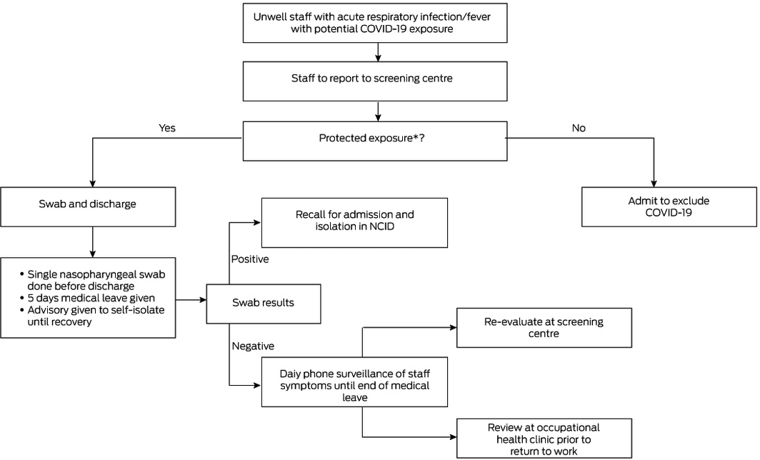 Since the transmission of SARS‐CoV‐2 to health care workers was reported on 20 January 2020,23 twice‐daily temperature monitoring was mandated for all frontline health care workers in all public hospitals. Health care workers in direct contact with COVID‐19 patients who developed fever or symptoms of acute respiratory infection were encouraged to declare their symptoms to their superiors and present themselves to the screening centre, to be managed based on their exposure risk (Box 4). A health care worker with protected exposure was defined as one who was, at least, wearing a surgical mask. If symptomatic, the health care worker was tested, given 5 days of medical leave and placed under phone surveillance for symptom progression. Those with unprotected exposure were quarantined if asymptomatic, while those with symptoms were managed as high risk suspect cases. Before returning to work, health care workers who tested negative and had completed the duration of medical leave, were assessed at the occupational health clinic for resolution of symptoms. As of 30 April, a total of 1309 health care workers had been evaluated, of whom 69 had been admitted and 8 (0.8%) had tested positive.
