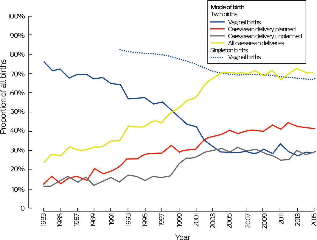About 2% of all pregnancies in Australia are twin pregnancies, but perinatal mortality and morbidity are disproportionately high for these pregnancies.1,2 The numbers of twin births by caesarean delivery have been increasing worldwide,3,4,5 and there have been calls to reduce the overall number of caesarean deliveries in countries with high rates, including Australia.6,7 While factors that influence its use in singleton pregnancies have been investigated, including maternal age, parity, and obesity,8 caesarean delivery of twins has received less attention. Given high level evidence that routine caesarean delivery of twins does not benefit mothers or babies9,10 and the recent suggestion that vaginal birth may actually be preferable,11 the mode of birth in uncomplicated twin pregnancies should be considered carefully.