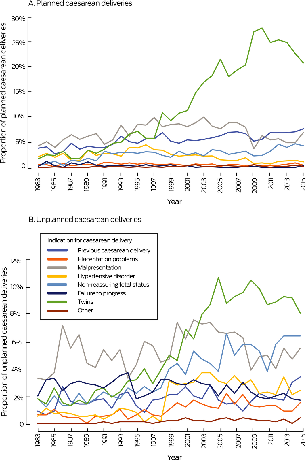 The number of planned caesarean deliveries with twin pregnancy as the indication increased from 12 of 658 (1.8%) in 1983 to 231 of 1102 births (21%) in 2015, and that of unplanned caesarean deliveries from 16 of 658 (2.4%) to 93 of 1102 births (8.4%) (in each case: for trend, P < 0.001). These were the most marked rises for any single indication. The proportion of planned caesarean deliveries with previous caesarean delivery as the principal indication increased from 3.8% (25 of 658 deliveries) in 1983 to 7.7% (85 of 1102 deliveries) in 2015; the proportion of unplanned caesarean deliveries with this indication increased from 0.9% (six of 658 deliveries) to 3.4% (38 of 1102 deliveries; in each case: for trend, P < 0.001). The proportion of planned caesarean deliveries with non‐reassuring fetal status as primary indication increased from 0.3% (two of 658 deliveries) to 4.3% (47 of 1102 deliveries; P < 0.001) and of unplanned caesarean deliveries from 1.8% (12 of 658 deliveries) to 6.4% (70 of 1102 deliveries; for trend, P < 0.001) (Box 3).