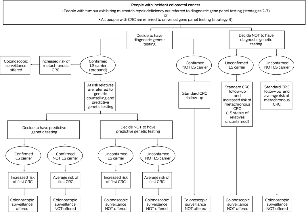 In some countries, including the United Kingdom,4 routine testing for LS is recommended for patients with incident CRC. In Australia, there is no national LS testing policy and the availability and practice of testing varies between clinicians, pathology providers, and states and territories.5 The most recent clinical CRC management practice guidelines encourage dMMR tumour testing for all patients with CRC as a “practice point” (a recommendation based on expert opinion and formulated in a consensus process).6 The Royal College of Pathologists of Australasia recently submitted an application to the Medical Services Advisory Committee requesting funding of germline gene panel testing for heritable mutations associated with increased risk of CRC and endometrial cancer; the panel of 11 genes includes the four MMR genes and the epithelial cell adhesion molecule gene (EPCAM).7 Two recent economic evaluations in Australia found that routine LS testing of people with incident CRC can be cost‐effective.7,8 However, no published assessment of systematic LS testing in Australia has taken into account all feasible combinations of relevant testing and triage options, including those for somatic mutation testing after dMMR immunohistochemistry or microsatellite instability testing.