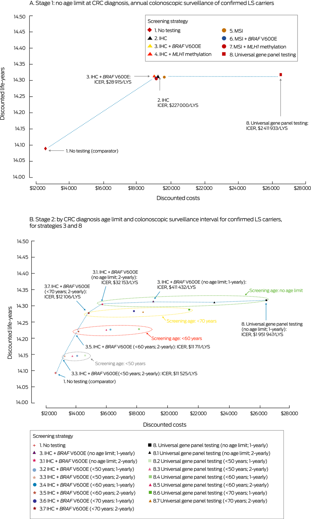 In the Stage 2 analysis, the most cost‐effective testing strategy was MMR immunohistochemistry and reflex BRAF V600E testing, with 2‐yearly colonoscopic surveillance of confirmed LS carriers. The estimated ICERs were $11 525/LYS (age limit, < 50 years), $11 711/LYS (age limit, < 60 years), $12 106/LYS (age limit, < 70 years), and $32 153/LYS (no age limit), with more life‐years saved at increased cost as the age cut‐off is eased (Box 3; Box 4, B). An additional 4778–15 860 colonoscopies would be required over the lifetimes of 2420 LS carriers, and 46–181 CRC deaths would be averted (88–103 extra colonoscopies per averted CRC death) (Box 5). Universal germline gene panel testing with 2‐yearly surveillance would avert up to three more CRC deaths, but would not be as cost‐effective as universal dMMR tumour testing strategies. The ICER for universal gene panel testing strategy without age limit and annual colonoscopic surveillance (strategy 8) was $1 951 947/LYS. Reducing the colonoscopic surveillance adherence rate to 70% slightly reduced the cost‐effectiveness of these testing strategies, but the ranking of strategies by cost‐effectiveness remained the same; the ICER for immunohistochemistry/BRAF V600E testing ranged between $12 722/LYS and $37 858/LYS (Supporting Information, section 9).