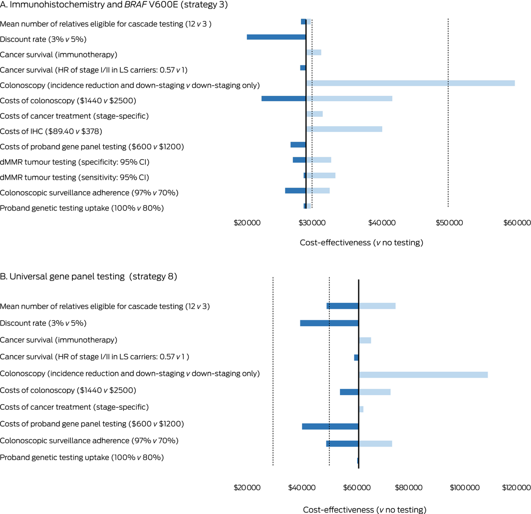 CI = confidence interval; dMMR = mismatch repair deficiency; HR = hazard ratio; IHC = immunohistochemistry. * The change in cost‐effectiveness associated with the first indicated value for a parameter is depicted by the darker (left side) bars, which indicate lower cost‐effectiveness ratio (ie, more cost‐effective), the change associated with the second value is depicted by the lighter (right side) bars, which indicate higher cost‐effectiveness ratio (ie, less cost‐effective).Solid vertical line: Stage 1 cost‐effectiveness estimate; dotted vertical lines: indicative willingness‐to‐pay threshold $30 000–$50 000/life‐year saved.For sensitivity and specificity of dMMR tumour testing, 95% CIs of pooled estimates for IHC, microsatellite instability, BRAF V600E, and MLH1 hypermethylation tests were varied simultaneously.