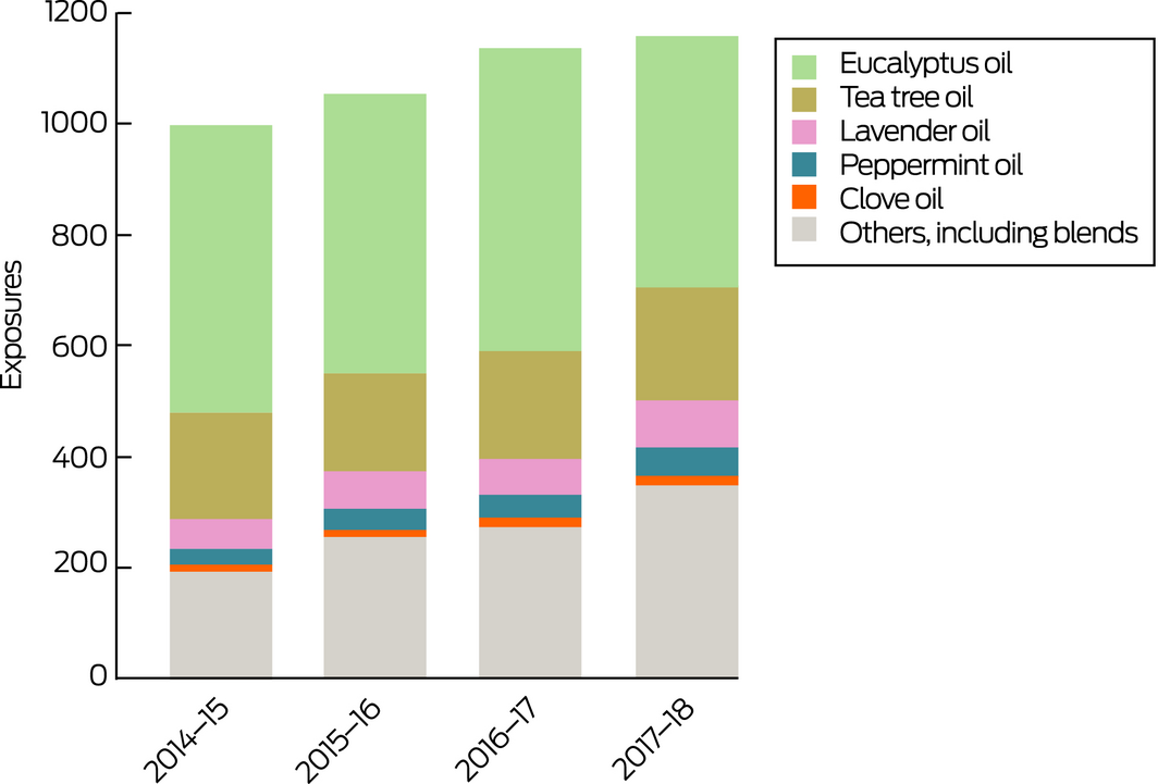 We found that essential oil exposures are frequent in Australia, and that more than half involve children. We identified a small subset of cases of misinformed misuse (intentional ingestion for perceived health benefits). Exposures are increasing in number, perhaps reflecting increased use of essential oils and indicating the need for public education. Safe storage is important, and we recommend that essential oils be kept separate from oral medications to prevent therapeutic errors. Flow restrictors and child‐resistant closures would be desirable, but containers are only required to have such closures when the essential oil volume exceeds 15 mL; as severe toxicity can be caused by as little as 5 mL, this is inadequate for protecting children. Health care professionals and members of the public can receive advice about essential oil exposures from the Poisons Information Centre on 131126 (24 hours, Australia‐wide).