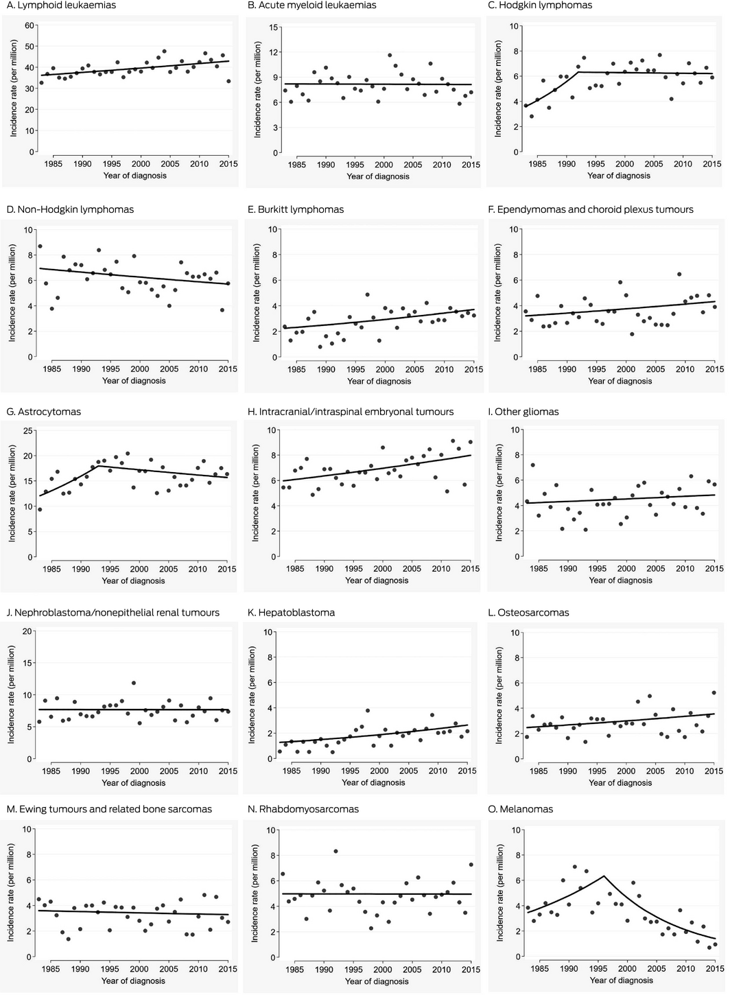 At the diagnostic subgroup level, incidence rates for hepatoblastoma (APC, +2.3%; 95% CI, +0.8% to +3.8%), Burkitt lymphomas (+1.6%; 95% CI, +0.4% to +2.8%), osteosarcomas (APC, +1.1%; 95% CI, +0.0 to +2.3%), intracranial and intraspinal embryonal tumours (APC, +0.9%; 95% CI, +0.4% to +1.5%), and lymphoid leukaemias (APC, +0.5%; 95% CI, +0.2 to +0.8%) each significantly increased across 1983–2015 (Box 3, Box 4). Melanoma was the only diagnostic subgroup for which there was a significant decline in incidence rates, from 1996 to 2015 (APC, –7.7%; 95% CI, –10% to –4.8%), reversing the significant increase between 1983 and 1996.