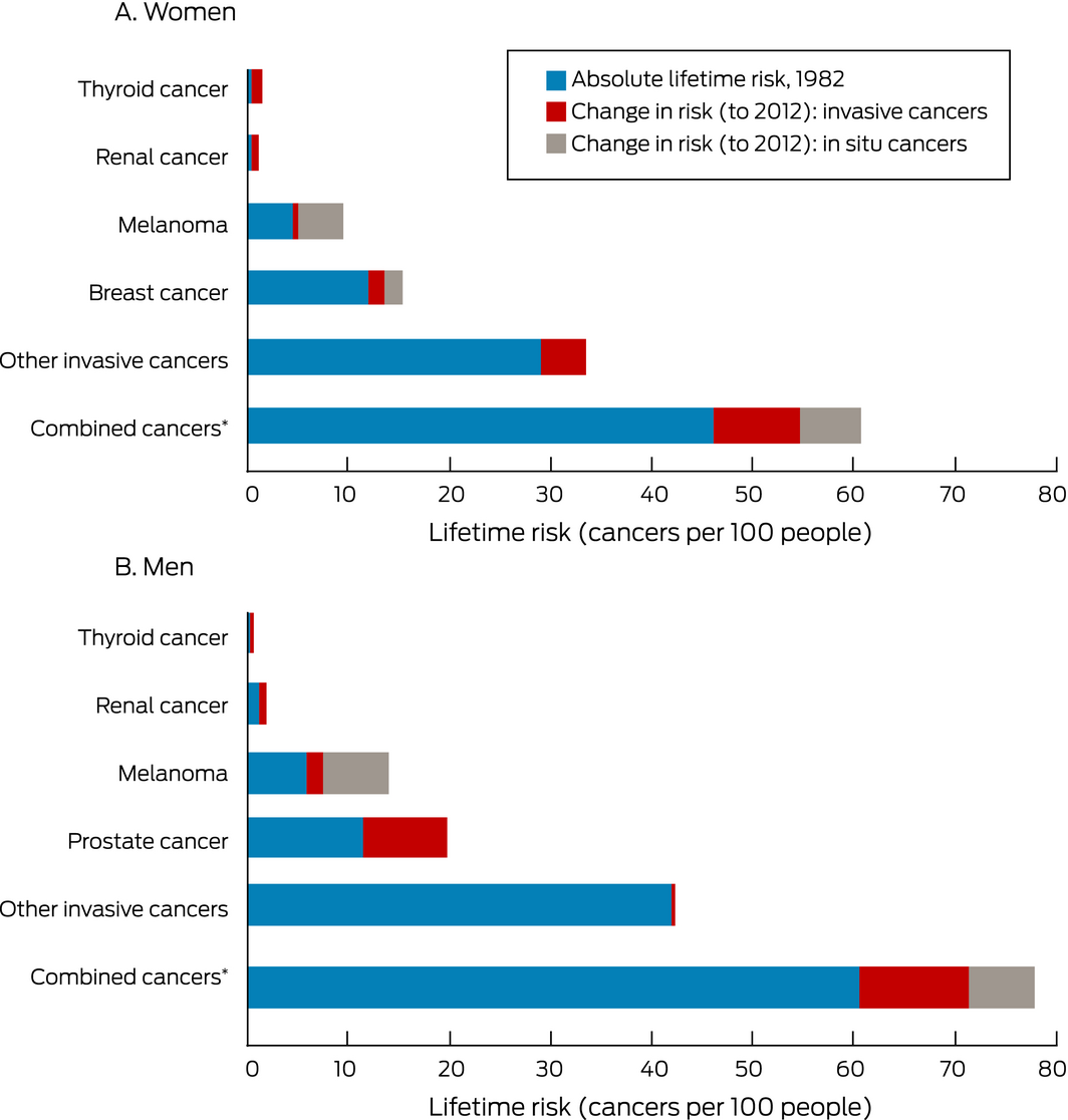 Design, setting, and participants: Routinely collected Australian Institute of Health and Welfare national data were analysed to estimate recent (2012) and historical (1982) lifetime risks (adjusted for competing risk of death and changes in risk factors) of diagnoses with five cancers: prostate, breast, renal, thyroid cancers, and melanoma.
