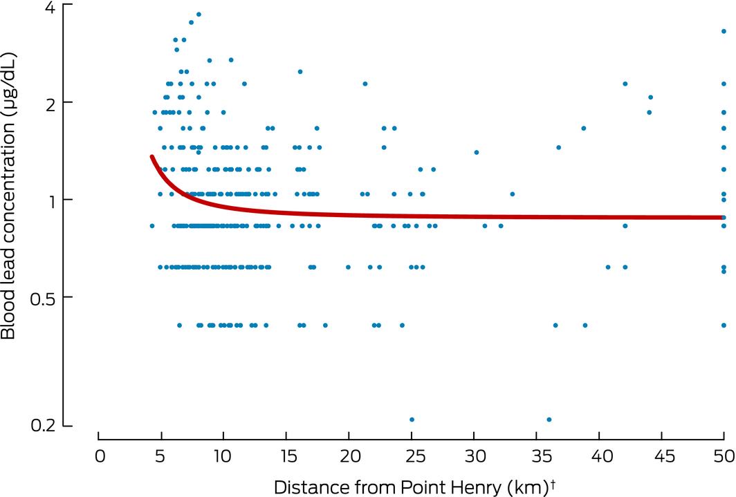 Living closer to a historical source of airborne lead was also associated with higher blood lead levels. The Point Henry aluminium smelter, closed in 2015, had been regionally important as a source of airborne lead; mean annual emissions during the 5 years preceding its closure were 118 kg (www.npi.gov.au/npidata). Our finding is similar to the recently reported association between distance from the silver/zinc/lead mine and blood lead levels in children in Broken Hill,28 where annual lead emissions in 2017/18 were 33 tonnes (www.npi.gov.au/npidata).