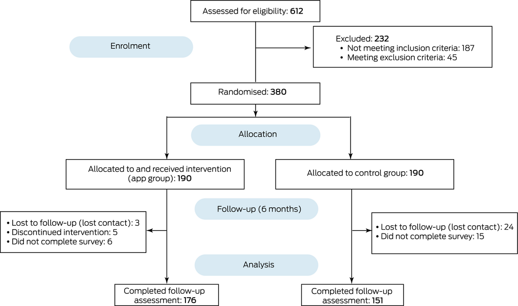 The trial was undertaken between December 2017 and August 2018; participants were recruited between December 2017 and February 2018. A total of 612 people from the Sichuan Provincial People's Hospital epilepsy registry database were assessed for eligibility; 380 (62.1%) met our criteria for participation and were enrolled and assigned to the app and control groups (1:1) using permuted blocked randomisation. One investigator (YN) generated block randomisation sequences (block size of four); one of the block sequences was then selected by the randomisation program, and consecutive participants allocated to the app and control groups according to the randomisation sequence. Each participant of a particular age and sex was randomised to the app or control group and the next enrolee with the same characteristics was automatically assigned to the other group. To minimise the predictability of the allocation process, the randomisation sequence was concealed from all investigators until all patients had been assigned (Box 1).