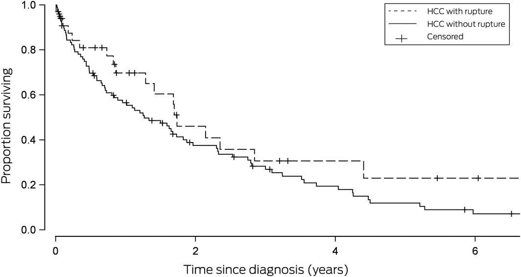 Although our study encompassed ten years of data, the number of patients with ruptured HCC was small, consistent with the low incidence of rupture in Western countries (2–3%).5 Reporting and ascertainment bias were possible, as some patients may have died before reaching hospital or while undergoing confirmatory imaging. However, our study is the first in Australia to specifically examine the influence of spontaneous rupture as a prognostic factor in patients with HCC, using propensity matching to adjust for variables known to influence survival.