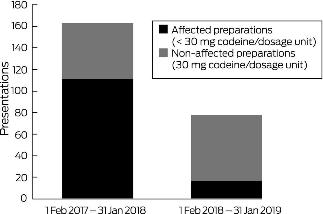 A total of 2235 patients presenting with poisoning were managed by our unit during the 12 months preceding the rescheduling of codeine, and 2516 during the subsequent 12 months, a 13% increase. However, the number of codeine‐related presentations was 53% lower during the second period: there were 163 presentations before and 77 presentations after rescheduling (P < 0.001). This decline followed the number of codeine‐related presentations rising from 133 in 2015 to 159 in 2016. The numbers of presentations involving 30 mg codeine products, the status of which was unaffected by rescheduling, were similar for the two periods (52 before, 60 after rescheduling; P = 0.92). In contrast, the number of presentations involving codeine products affected by the change (< 30 mg) was 85% lower after rescheduling (111 presentations before, 17 presentations after rescheduling; P < 0.001; Box). The decline in codeine‐related presentations was not associated with a rise in alternative opioid‐related presentations (185 alternative opioid‐related presentations before, 178 after rescheduling; P = 0.13).