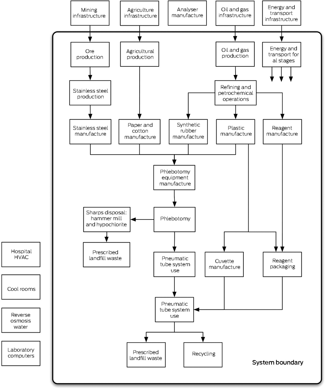 Design, setting: Prospective life cycle assessment of five pathology tests in two university‐affiliated health services in Melbourne. We included all consumables and associated waste for venepuncture and laboratory analyses, and electricity and water use for laboratory analyses.