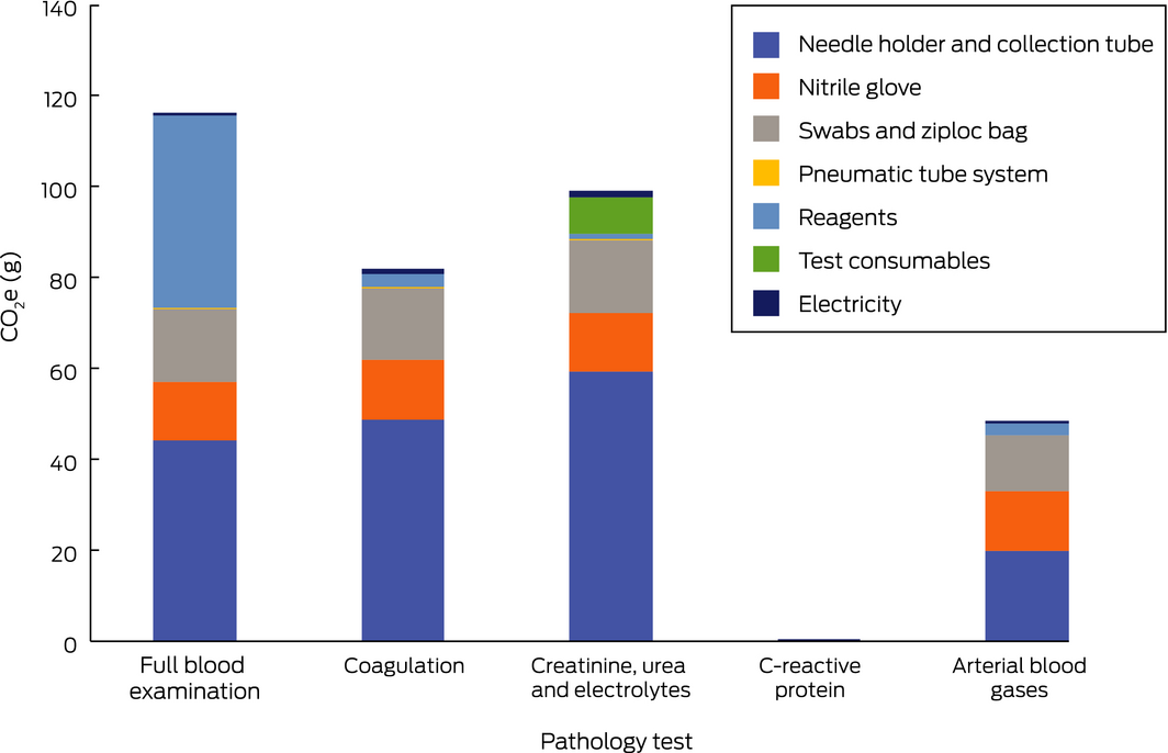We report for the first time the life cycle carbon footprint of five common hospital pathology tests. The CO2e emissions associated with two haematology tests (full blood examination, coagulation profile) were similar, but those associated with biochemistry tests (U&E, CRP, ABG) differed according to whether additional venepuncture and collection were needed. The carbon footprints of the tests were principally associated with blood sample collection (including test tube plastics) rather than reagents or power use. The estimated CO2e emissions for each test were equivalent to those of driving a standard Australian car between 3 m (CRP) and 770 m (full blood examination). While the greenhouse gas impact of individual tests is relatively small, 17.8 million haematology and 56.2 million biochemistry tests were funded by Medicare during 2018–19.23