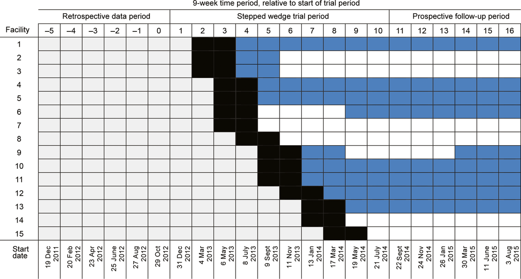 Box 1 – Schedule for the stepped wedge cluster randomised trial, including retrospective pre‐trial data and prospective follow‐up periods