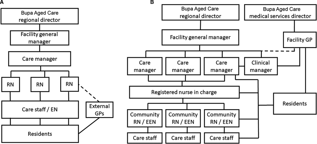 The organisational structures and reporting lines at the participating residential aged care facilities during the standard model of care (control) and the new model of care (intervention) are depicted in Box 2.