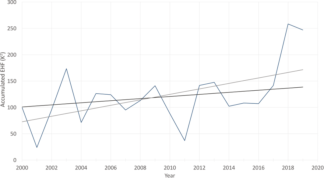 Calculating two trends through these data (the 20 years presented, and a longer 50‐year trend extending from 1970 to 2020) allows an assessment of long term change, which demonstrates a 37% increase in excess heat factor over this 20‐year period, as well as an understanding of the accelerated rate of change, with a 136% rise seen over the past 20 heatwave seasons. Weighting the accumulated excess heat factor according to the population density has a similar result, with the 50‐ and 20‐year heatwave season accumulated excess heat factor rises being 33% and 97% respectively (Supporting Information 1.2).