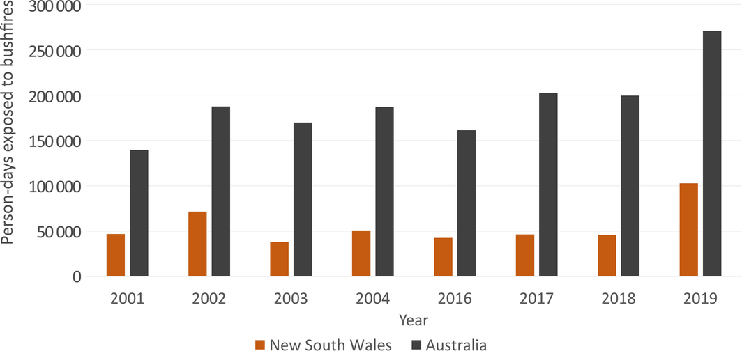 Box 3 – Annual person‐days exposed to bushfires during 2001–2004 and 2016–2019 in New South Wales and Australia