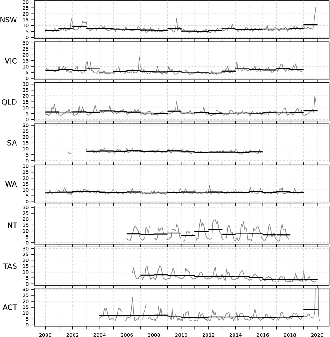 The annual average background concentration of particulate matter less than 2.5 μm in diameter (PM2.5) in typical urban settings in Australia is generally low by international standards. However, the contribution of extreme events such as bushfires and dust storms, as well as regular seasonal variation due to dry season fires in the NT and domestic wood heater use has led to periods of harmful pollution levels. Most of Australia’s premature deaths attributable to PM2.5 come from households, road transport and industry, providing opportunities to improve health through mitigation policies.15 This analysis calculates average PM2.5 concentration for all major Australian cities from 2000 to 2019 where data are available. We averaged city‐specific levels by state and territory (Box 4). While the annual average PM2.5 concentrations were generally below the Australian advisory reporting standard of 8 μg/m3, major bushfire seasons such as those that occurred in NSW in 2001–02, 2002–03 and 2019–20 were so extreme that they influenced the annual average PM2.5 concentrations in those years. At 13.0 μg/m3 and 11.2 μg/m3 respectively, the ACT and NSW annual average PM2.5 concentrations in 2019 far exceeded all previous years across all states and territories in this 20‐year analysis. Similarly, the monthly PM2.5 concentrations in the ACT and NSW in December 2019 were the highest of any month in this 20‐year analysis, reaching an average of 71.6 μg/m3 and 26.0 μg/m3 respectively (Supporting Information 3.2).