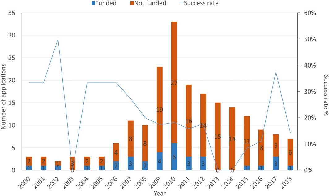 In this report, we also present, for the first time, data on National Health and Medical Research Council (NHMRC) health and climate change grant applications from 2000 to 2018 (Box 8). After a period of limited grant applications on health and climate change per year (two to three) from 2000 to 2005, the number peaked at 33 in 2010, due to a partnership between the NHMRC and the former Department of Climate Change. However, since then, the annual rate has decreased every year, to seven applications in 2018. In keeping with the field, the success rate of these applications has been volatile, dropping below 20% in the past decade and with none of the 29 applications submitted in 2013 and 2014 being successful. The NHMRC has since committed $10 million over 5 years for a special research initiative, commencing in 2021, to boost research capacity and capability to address health implications of environmental change. In addition, $5 million funds from the Medical Research Future Fund were allocated for research into the health impacts of bushfire in early 2020 (Supporting Information 5.2).