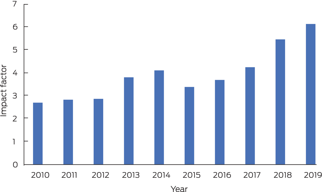 Of the many measures of journal standing, global prestige (ranking), reach (readership and article downloads), and impact (on practice and policy) are arguably the ones that matter most. In terms of prestige, the MJA is pleased to report that Clarivate has recently announced that our Journal Impact Factor has again increased, climbing from 5.44 for 2018 to 6.11 for 2019, placing our Journal among the top 16 general medical journals globally (Box). The mja.com.au readership has markedly increased in 2020. During the first five months there were 2.5 million page views, with visitors from almost every country, compared with 1.7 million for the equivalent period in 2019: an increase of nearly 50%. In terms of impact, the number of submissions to the Journal continues to rise, as does media interest in our articles. Almost twice as many manuscripts were submitted during the first half of 2020 as during the same period last year, with about one‐third COVID‐19‐related. As space in the pages of the MJA remains limited, we focus on excellence and must regrettably decline many worthy articles.