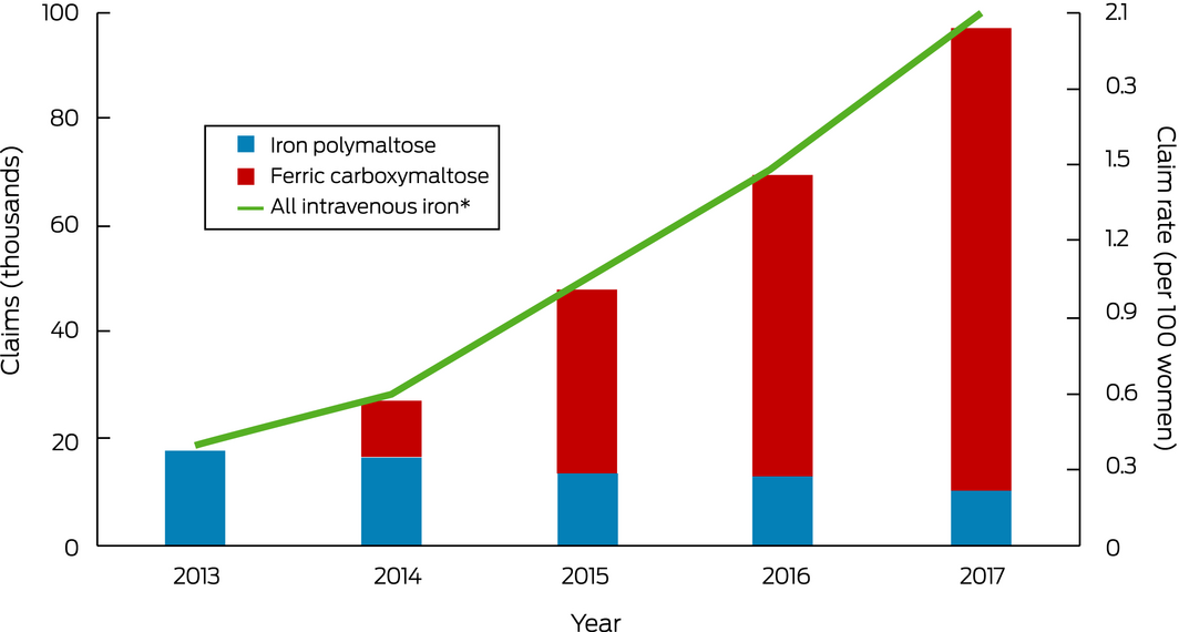 In 2017, intravenous iron was dispensed to one in fifty Australian women of reproductive age, five times the proportion in 2013; in 2017, 90% of these women received ferric carboxymaltose. The optimal rate of intravenous iron treatment is unknown, and there are no comparable overseas data. As possible adverse outcomes include permanent skin staining and the risk (albeit rare) of potentially fatal anaphylaxis,5 intravenous iron should be administered in settings where allergic reactions can be treated promptly, but whether this is generally the case is not known. Intravenous iron therapy for women of reproductive age also has considerable financial implications: based on average PBS prices,6 its total annual cost increased 35‐fold, from $0.75 million in 2013 to $26.9 million in 2017. However, we have probably underestimated the use of intravenous iron therapy, as we included only PBS‐subsidised dispensing, which may not include preparations administered to public hospital inpatients.