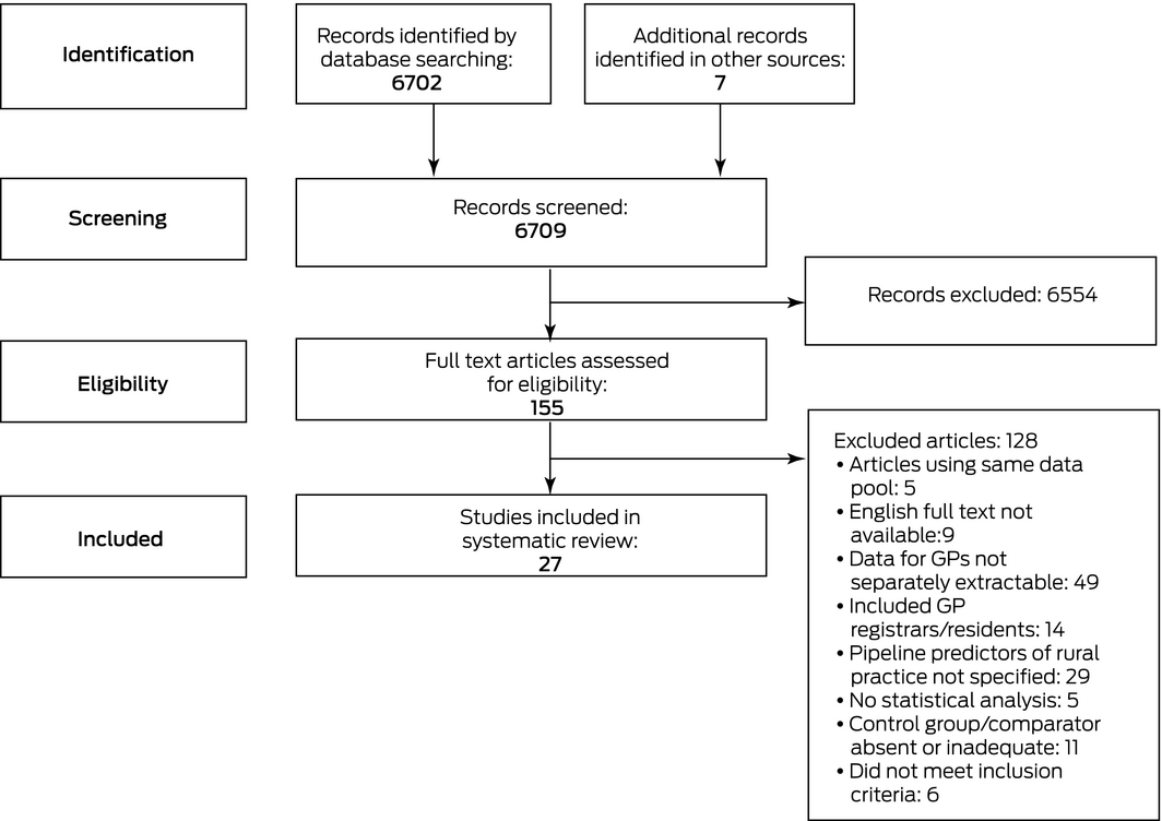 Understanding the effects of rural pipeline factors — including the recruitment of rural students and providing opportunities for rural placement during medical school and residency and vocational training12,13,14,15 — should inform strategies and national policies for attracting GPs to rural clinical practice. The aim of our review was to synthesise quantitative data on the effects of rural background and of experience in rural areas during medical training or during postgraduate GP training on the likelihood of GPs practising and remaining in rural areas.
