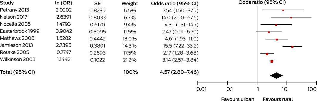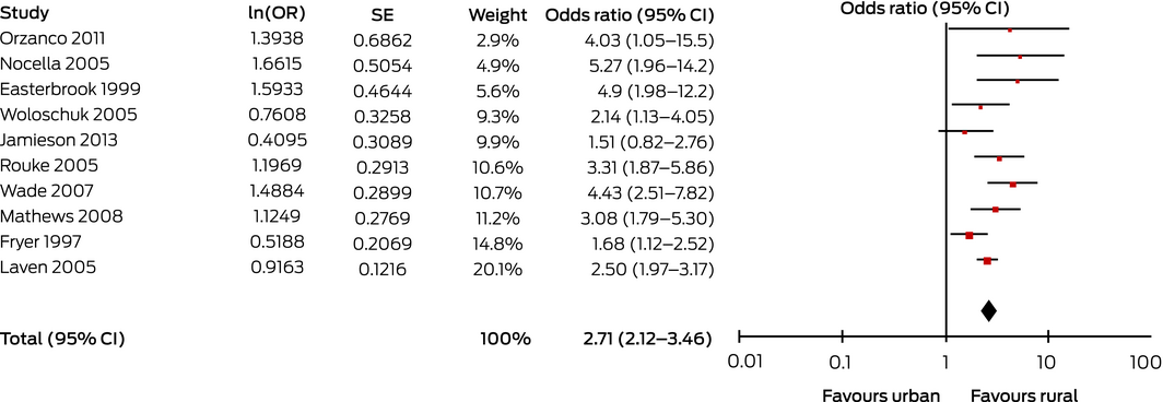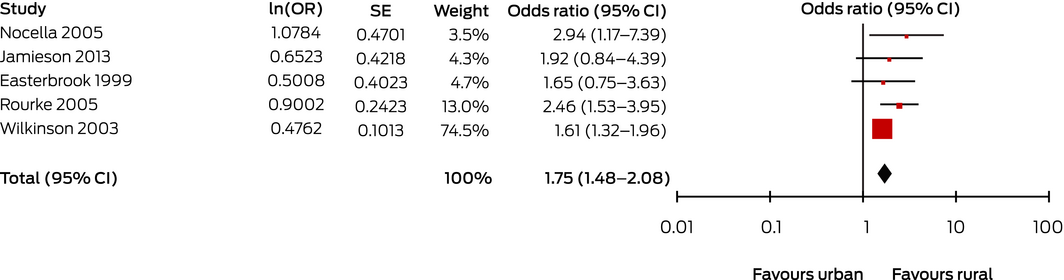 The included studies were all observational studies. The heterogeneity of investigations of rural background and rural postgraduate training was considerable, largely because of the diversity of rural definitions and the type and duration of postgraduate rural training. Many studies relied on self‐reported information, and students with pre‐existing interest in rural practice who participated in rural rotations or programs would cause self‐selection bias. Many studies did not closely define the rural environment (eg, degree of rurality, community type, duration of experience) or used different classifications of rural area for exposure and outcome. Applying binary definitions of remoteness (ie, rural v urban) may obscure important differences between regional and remote areas. Several studies adjusted their analyses for other variables, but only one24 accounted for the influence of undergraduate rural medical experience when assessing the influence of postgraduate rural experience. Similarly the influence of rural postgraduate training on the effect of undergraduate rural experience could not be assessed.