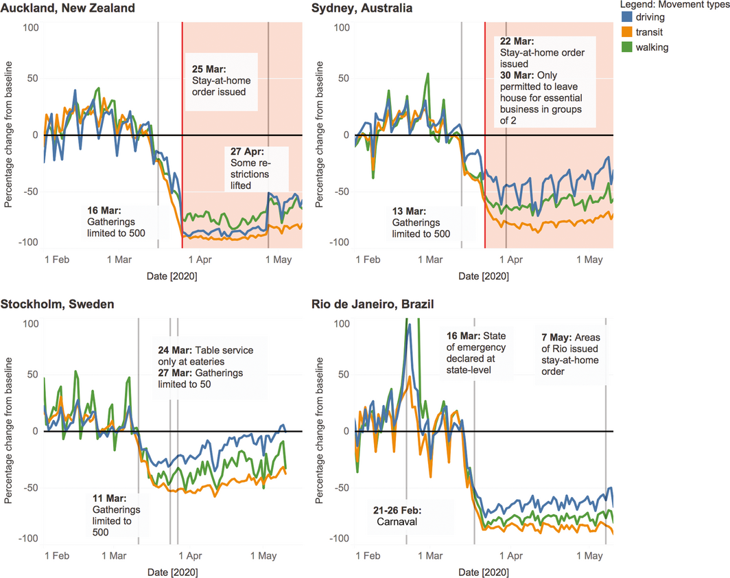 We postulate that global media coverage reiterating virus seriousness, broadcasting almost real‐time images of full intensive care units and dying families into people’s living rooms, in conjunction with minor public health restrictions, sparked fear and drove mass behaviour change. Even in cities with minimal restrictions, such as Stockholm, there was an average transit decrease of 47% in April 20201,4 (Box). In Rio de Janeiro, a city with conflicting government advice and minimal restrictions,3 across April there was an average 76% decrease in walking1 (Box). In Hong Kong,10 a city that did not deploy a stay‐at‐home advisory but had direct transport and cultural links to Wuhan and previous experience with severe acute respiratory syndrome (SARS) epidemics, movement dropped below baseline on January 23 (Supporting Information, Figure 6), well before other cities, with an ongoing reduction in transit walking of over 50%.1 Singapore11,12 (Supporting Information, Figure 6), with a similar history of SARS, showed a parallel picture to Hong Kong, suggesting that past experience also drives risk perception and behaviour. Individual and community risk perceptions will likely determine behaviour as lockdown restrictions ease. Governments planning for re‐opening or the second wave of the pandemic must combat complacency and social distancing fatigue. Behaviour in Hong Kong and Singapore suggests prior experience can lead to early voluntary social distancing. However, government restrictions may be needed for sustained social distancing. Pandemic‐naïve populations with low restrictions, such as Stockholm and Atlanta13 (Supporting Information, Figure 1), have up‐trending mobility.1