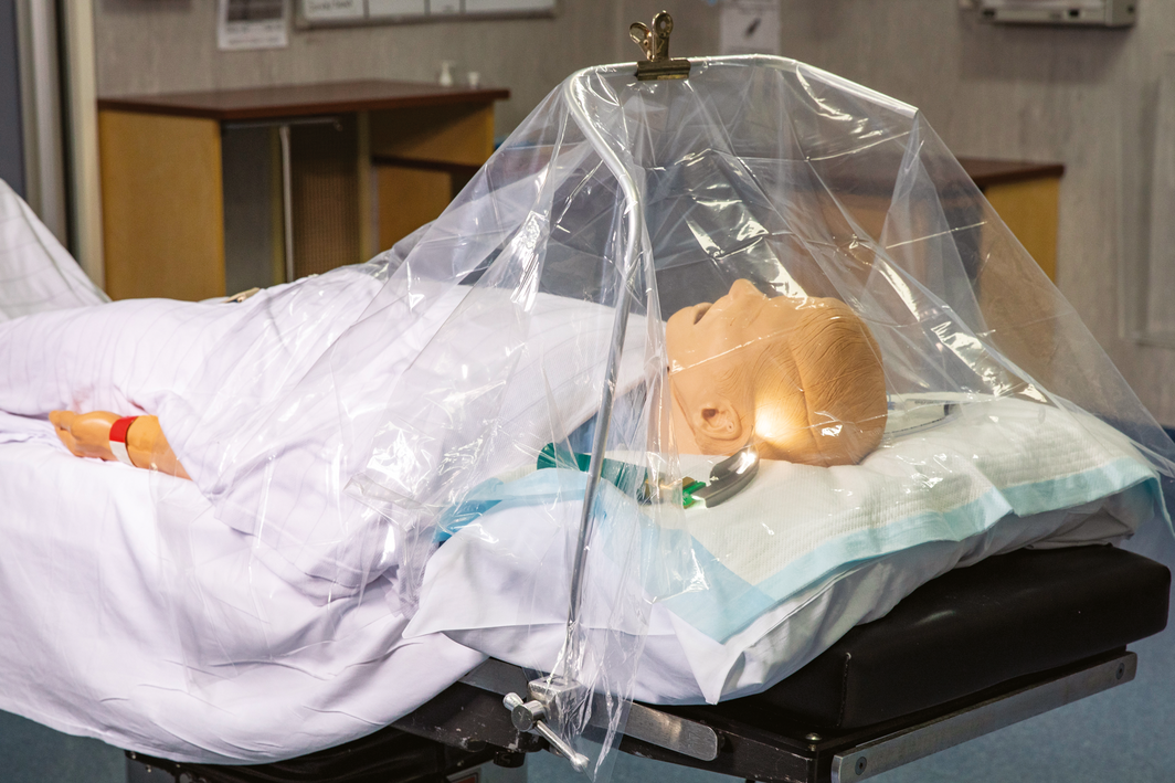 Personal protective equipment (PPE) provided incomplete protection for health workers against the severe acute respiratory syndrome (SARS) coronavirus.1 Engineering controls are more effective than PPE for reducing the risk of exposure to occupational hazards,2 and protective enclosures have been proposed for use during medical airway procedures.3,4 While enclosures appear to effectively prevent droplet contamination, their ability to specifically protect workers from aerosols has not been quantitatively assessed. To investigate whether an enclosure reduces aerosol exposure during the intubation of patients, we constructed a tent by covering an aluminium bar with a 1200 mm × 1400 mm clear plastic drape (Linear Medical) (Box 1).