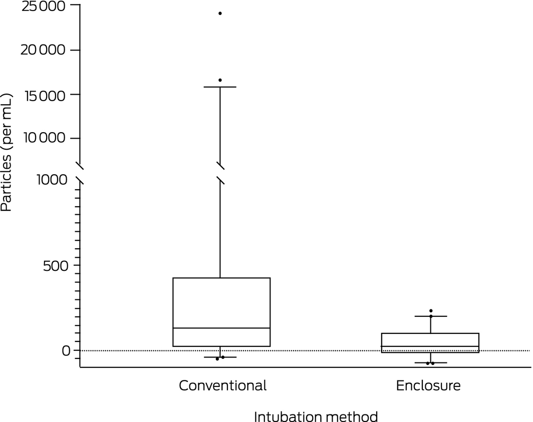 The median change in aerosol count during intubation was lower when the enclosure was used (23 mL−1; interquartile range [IQR], –19 to 98 mL−1) than when it was not (125 mL−1; IQR, 14–434 mL−1; P < 0.001). Even after removing all values exceeding 1000 mL−1, the difference between groups remained statistically significant (conventional: median difference, 108 mL−1; IQR, –1 to 189 mL−1; with enclosure: 23 mL−1; IQR, –19 to 98 mL−1; P = 0.013) (Box 2). With conventional intubation, extreme values were measured when the operator moved their head closer to the manikin during intubation; the maximum value was 100 times as high as that measured during enclosed intubation. The median time to intubation was 22 s (IQR, 20–25 s) with the enclosure and 21 s (IQR, 18–24 s) with the conventional technique (P = 0.18).