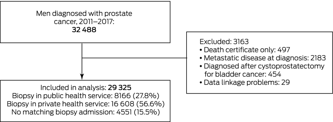 Men with localised prostate cancer were categorised as private or public patients according to the health service at which the prostate biopsy closest to the VCR‐defined diagnosis date was performed. Only biopsy‐related admissions within three months of the VCR‐defined diagnosis date were included; 97% of included biopsies were performed within three days of diagnosis.