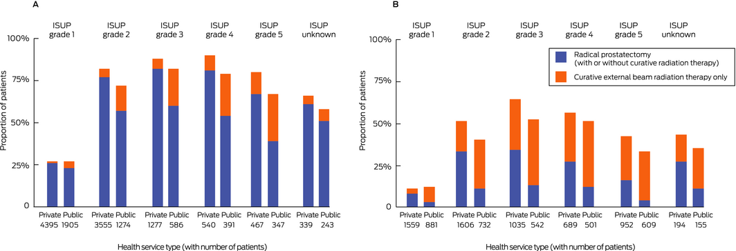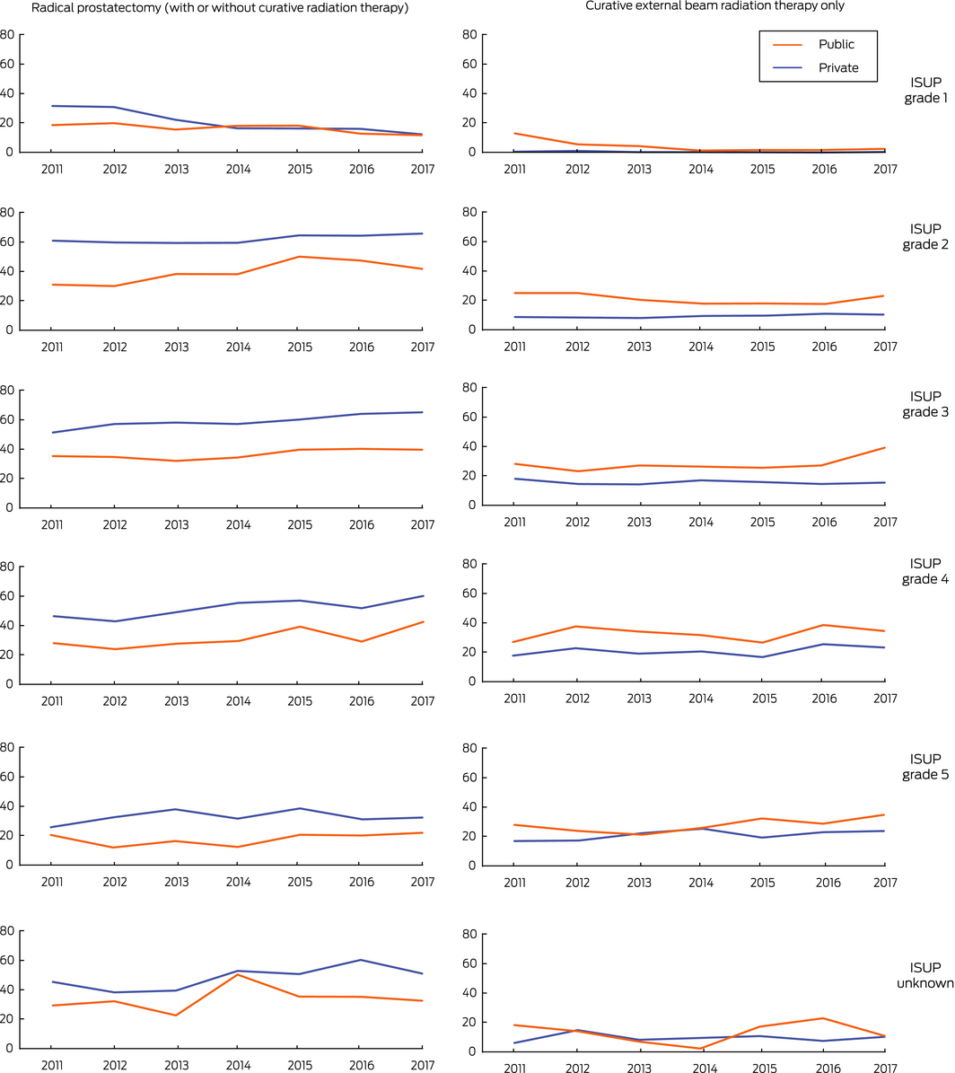 Results: After adjusting for age, tumour classification and comorbidity, men diagnosed in private health services received radical treatment more frequently than men diagnosed in public health services (odds ratio [OR], 1.40; 95% confidence interval [CI], 1.31–1.49). The proportion of private patients who underwent radical prostatectomy was larger than that for public patients (44% v 28%; OR, 2.28; 95% CI, 2.13–2.44) and the proportion of private patients who received curative external beam radiation therapy alone (excluding brachytherapy) was smaller (9% v 19%; OR, 0.45; 95% CI, 0.42–0.49). These differences were apparent for all International Society of Urological Pathology (ISUP) tumour grades. The magnitude of the difference for prostatectomy was greater for men aged 70 years or more; for radiation therapy alone, it was larger for those diagnosed before age 70. The differences between private and public services narrowed during 2011–2017 for men with ISUP grade 1 disease, but not ISUP grade 2–5 tumours.