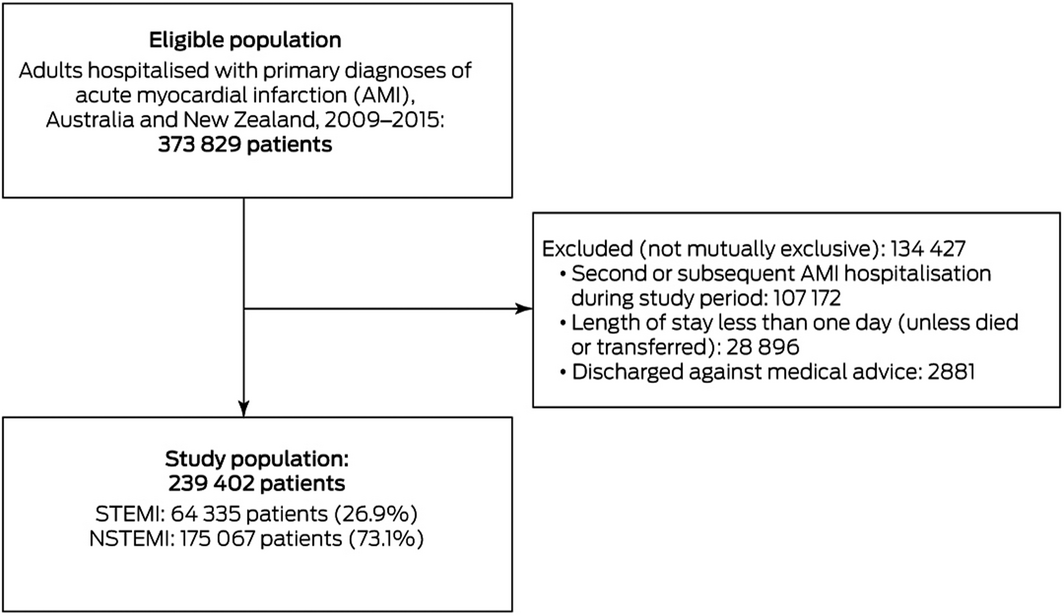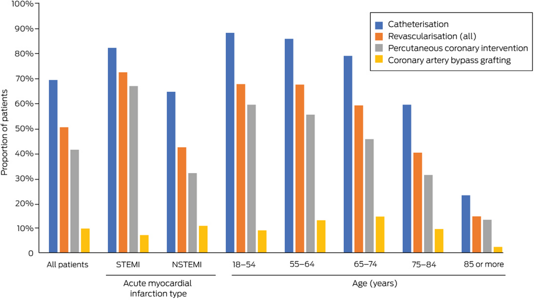 We included adults (18 years or older) admitted to hospital with primary diagnoses of AMI (ICD‐10‐AM codes I21.0‒21.3 for STEMI, I21.4 for NSTEMI) during 1 January 2009 ‒ 31 December 2015. We excluded second and subsequent hospitalisations with AMI during the study period, patients with hospital lengths of stay of less than one day unless they had died or were transferred to another hospital (as they were unlikely to have had an AMI), and patients who discharged themselves against medical advice. Patients were stratified by AMI type (STEMI, NSTEMI), whether they underwent revascularisation, and by age group.