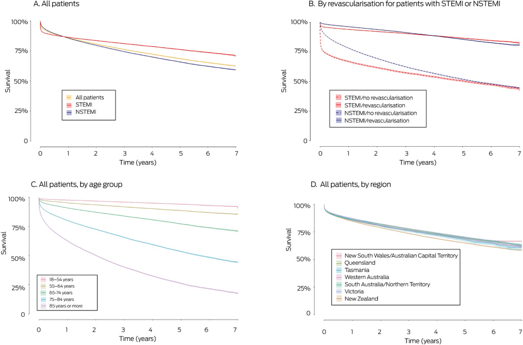 Conclusion: AMI care in Australia and New Zealand is associated with high rates of long term survival; 7‐year rates exceed 80% for patients under 65 years of age and for those who undergo revascularisation. Efforts to further improve survival should target patients with NSTEMI, who are often older and have several comorbid conditions, for whom revascularisation rates are low and survival after AMI poor.