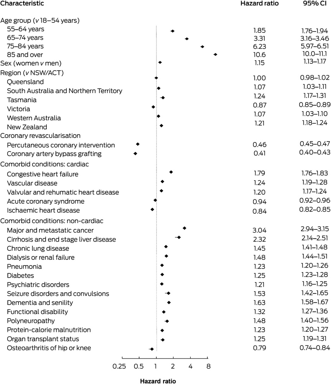 Being older (for example: ≥ 85 years v 18–54 years: aHR, 10.6; 95% CI, 10.1–11.1) or a woman (aHR, 1.15; 95% CI, 1.13–1.17) were each associated with greater long term mortality. Mortality was higher for patients admitted to hospital in Tasmania (v NSW/ACT: aHR, 1.24; 95% CI, 1.17–1.31) or New Zealand (aHR, 1.21, 95% CI, 1.18–1.24), and lower for those who presented in Victoria (aHR, 0.87; 95% CI, 0.85–0.89). Undergoing PCI (aHR, 0.46; 95% CI, 0.45–0.47) or CABG (aHR, 0.41; 95% CI, 0.40–0.43) was associated with better long term survival (Box 6).