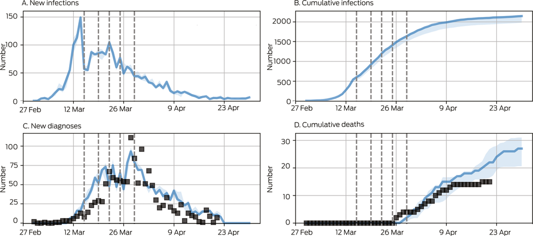 The probability of transmission per contact was varied such that the model matched the observed number of diagnoses and deaths over time. Baseline projections (blue) included policy changes on 19, 21, 22 and 29 March (dashed vertical lines; Supporting Information, F). Black squares represent data; blue lines and shaded areas are model projections (median and interquartile range for 100 simulations). Data were only available for new diagnoses, whereas the model also projects new infections. We estimated that by 30 April about 2000 people were COVID‐19‐positive, of whom about 1600 (80%) had been diagnosed. Most undiagnosed cases were asymptomatic infected persons.