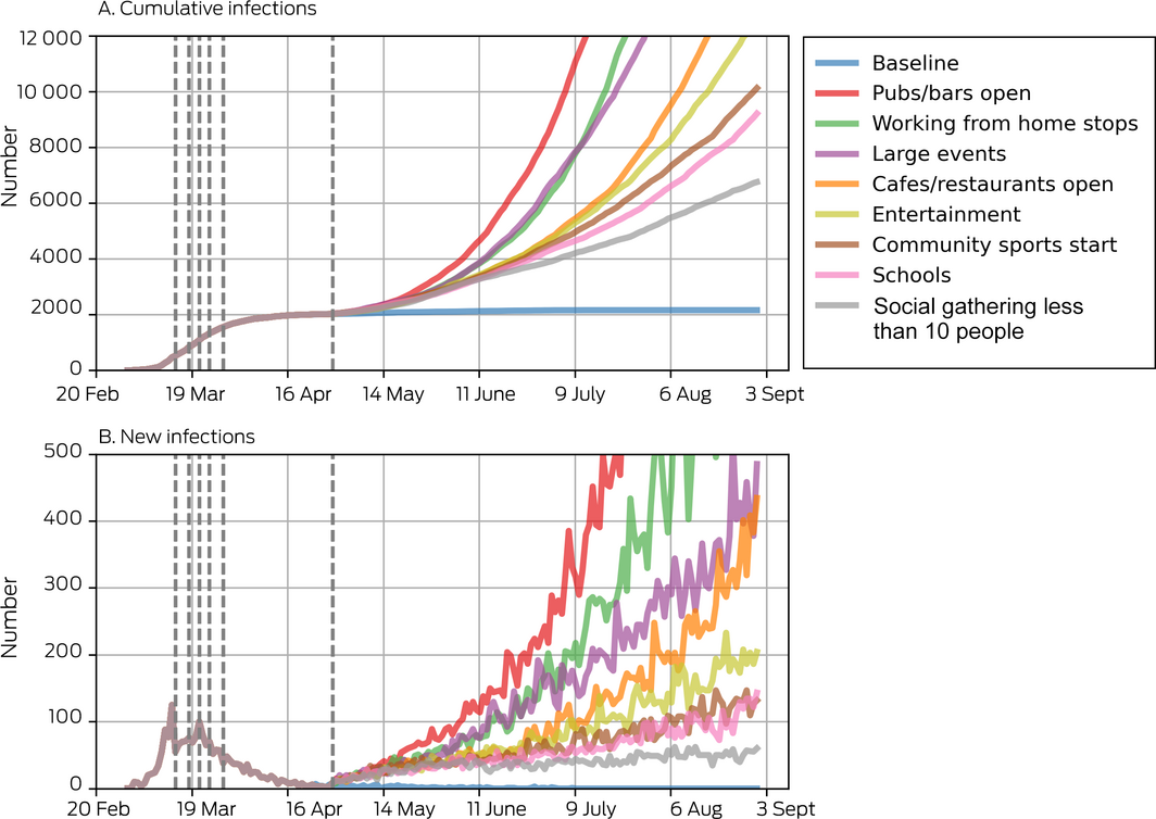 The implications: COVID‐19‐related restrictions should be lifted sequentially and gradually. To minimise public transport use, working from home should continue. Physical distancing restrictions are still required to mitigate the risks of opening pubs and bars.