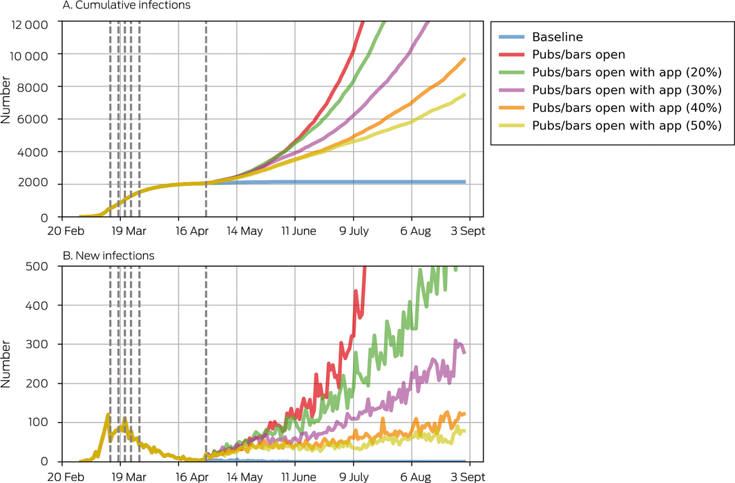 Box 3 – Projected cumulative and new COVID‐19 infections after re‐opening of pubs and bars, by population level of contact tracing smartphone app coverage