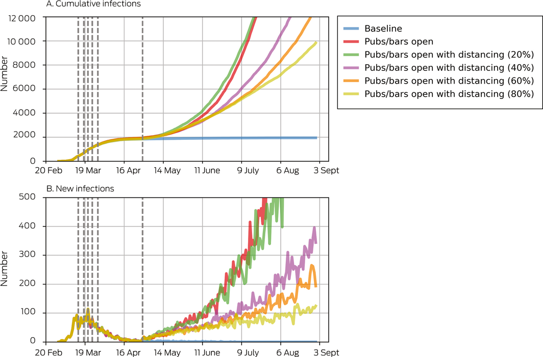 Box 4 – Projected cumulative and new COVID‐19 infections after re‐opening of pubs and bars, by reduction of virus transmission with physical distancing measures