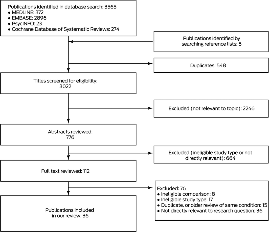 Data sources: MEDLINE, EMBASE, PsycINFO, Cochrane Database of Systematic Reviews; systematic reviews published 1 January 2010 – 30 April 2020.
