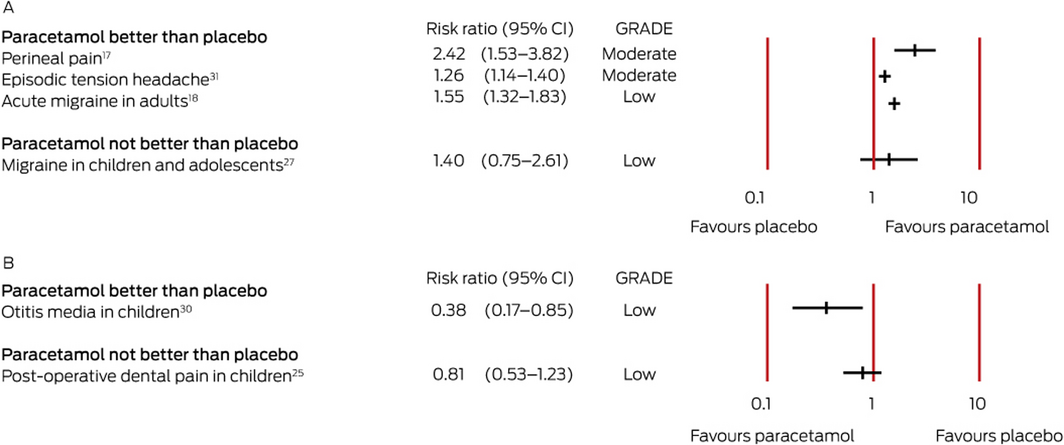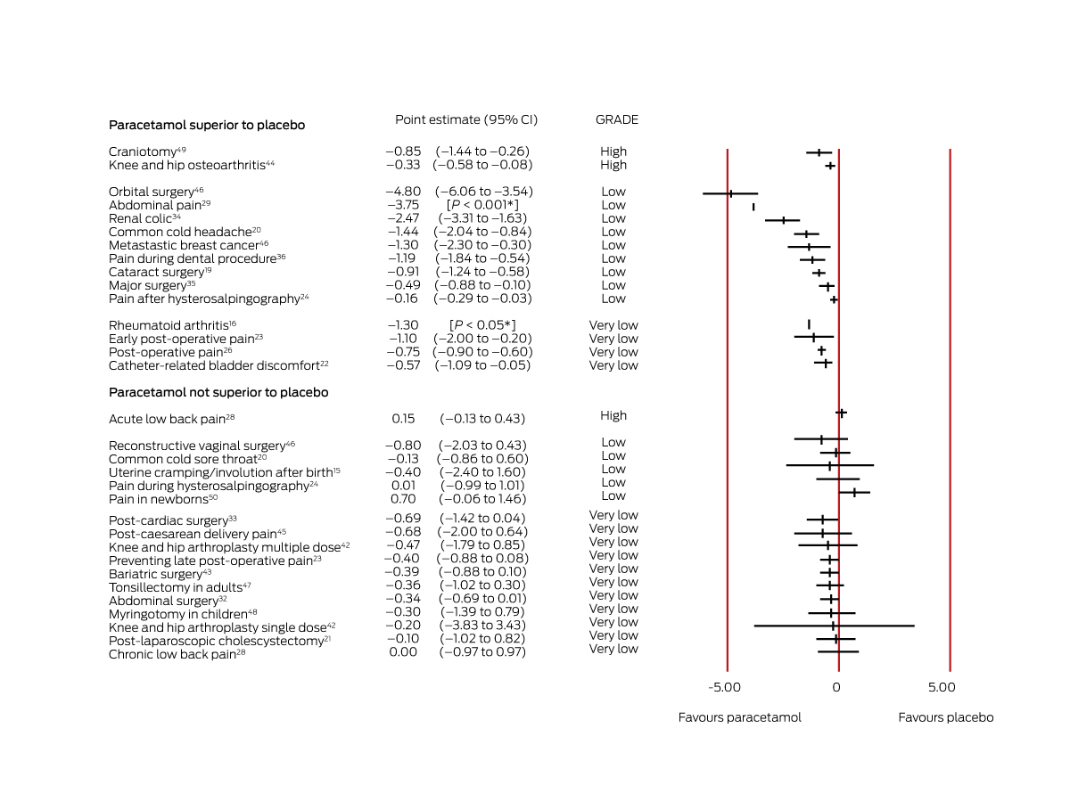 For two conditions, there was high quality evidence that paracetamol (1 g, up to four times per day) is more efficacious than placebo, but the effect sizes were very small (less than one point on a 0–10 scale). A systematic review of patients with knee or hip osteoarthritis (five RCTs, 1686 patients) found that paracetamol (4 × 1 g/day for up to 12 weeks) provided mean pain relief of 0.3 points on a 0–10‐point pain scale (95% CI, −0.6 to −0.1 points).44 Another review (four RCTs, 453 patients) found that paracetamol (4 × 1 g/day for 24 hours) reduced pain after craniotomy (MD, –0.8 points; 95% CI, –1.4 to –0.3 points)49 (Box 3).