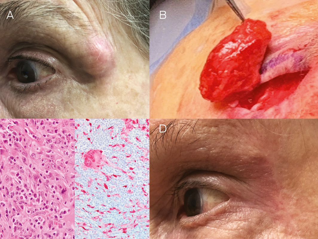 An 88‐year‐old white woman presented with a subcutaneous mass on the left lateral brow (Figure, A). She had been aware of this lesion for the past 8 years, but it had increased in size over the past 2 months, and was associated with erythema and a sensation of paraesthesia. Orbital ultrasound revealed a well defined subcutaneous hypervascular lesion with no invasion in the adjacent structures, but the appearances were non‐specific. She underwent excision biopsy (Figure, B). Histopathology (Figure, C; left: interlacing fascicles of malignant spindle shaped cells with background chronic inflammatory cell infiltrate [haematoxylin and eosin stain]; right, immunoperoxidase stain showing strong nuclear positivity for SOX10, a marker of malignant melanoma) revealed a malignant spindle cell melanoma with no perineural involvement. Wider excision was performed with adjunctive radiotherapy to the tumour bed. The post‐operative positron emission tomography (PET) and computed tomography scans were clear. At 6 months, the site was well healed with a good cosmetic result (Figure, D). Spindle cell melanoma is a rare subtype of malignant melanoma. This case highlights the importance of histopathological confirmation and follow‐up adjunctive therapies.1