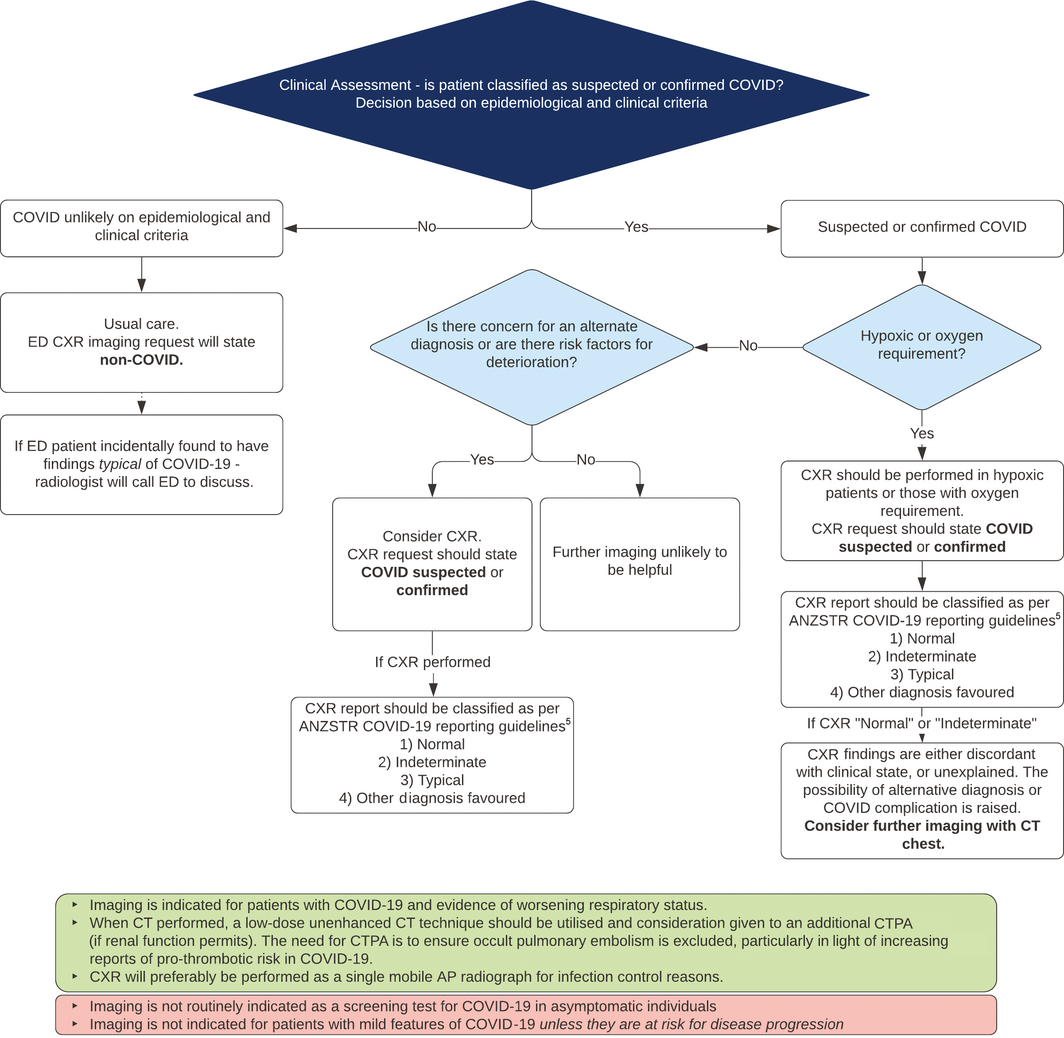 We reviewed consensus and position statements from the Royal Australian and New Zealand College of Radiologists, the Australian and New Zealand Society of Thoracic Radiology, the Fleischner Society and the British Society of Thoracic Imaging. Recommendations pertaining to high COVID‐19 prevalence environments and resource‐constrained environments were modified to suit a scenario of low prevalence. When local guidelines conflicted with international organisations, priority was given to local recommendations on the basis of relevance. Recommendations were subsequently integrated into a clinical imaging pathway in consultation with local specialists in radiology, emergency medicine, general medicine, respiratory medicine and infectious diseases (Box).