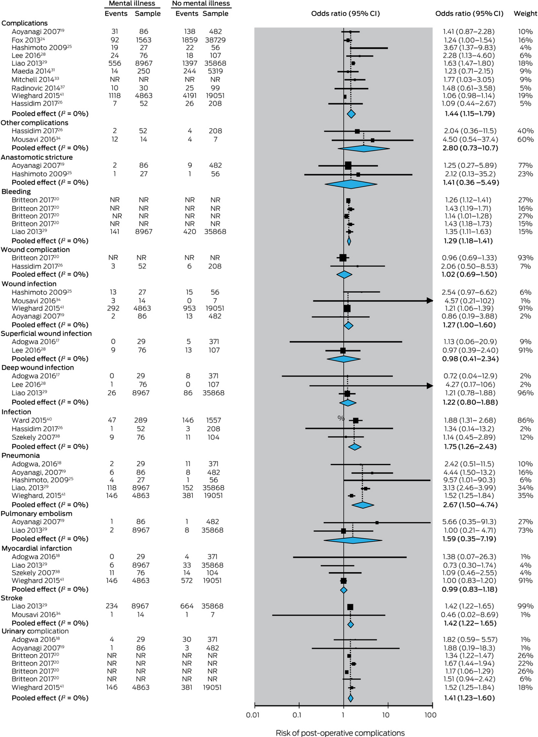 The association between having a serious mental illness and post‐operative complications was investigated in 17 studies,18,19,20,31,32,33,34,37,38,40,41 15 of which we included in our meta‐analysis. The association between having any serious mental illness diagnosis and having any post‐operative complication (ten studies, 125 624 patients) was statistically significant19,41 (pooled effect: OR, 1.44; 95% CI, 1.15–1.79) (Box 1). Restricting analysis to studies that used objective measures for determining serious mental illness diagnoses (eight studies, 115 704 patients)19,24,25,26,28,29,31,41 yielded a similar result (pooled effect: OR, 1.41; 95% CI, 1.11–1.79).