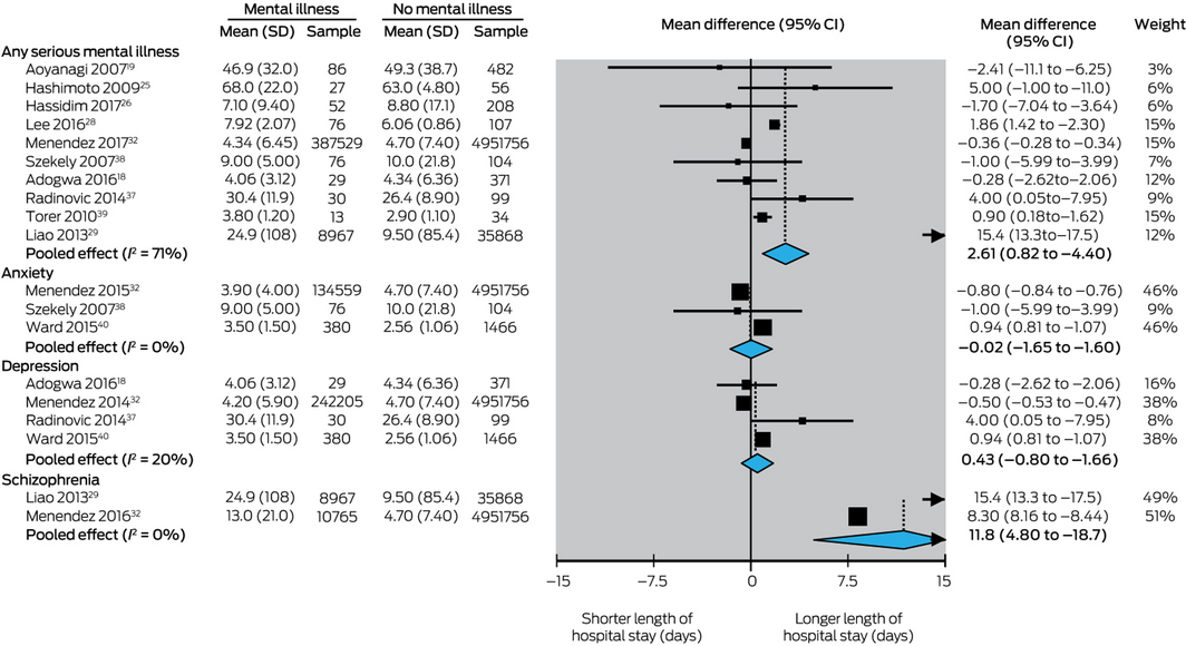 The mean hospital stay was longer for patients with schizophrenia than for those without schizophrenia (pooled effect: MD, 11.8 days; 95% CI, 4.8–18.7 days)29,32 but differences for patients with depression18,32,37,40 or anxiety32,38,40 were not statistically significant.