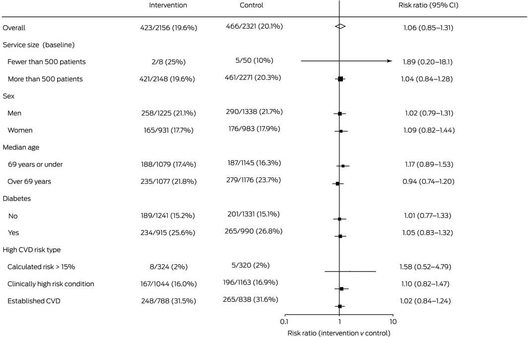 Differences in secondary outcomes between the control and intervention groups were not statistically significant, including the increased prescribing of any guideline‐recommended medications for undertreated patients with high CVD risk (intervention: 877 of 3588 patients, 24.4%; control: 959 of 3577 patients, 26.8%; RR, 0.94; 95% CI, 0.76–1.16) and appropriate CVD risk factor screening for all patients aged 45 years or more at baseline, or 35 years or more for Indigenous Australians (intervention: 12 837 of 21 894 patients, 58.6%; control: 13 319 of 21 425 patients, 62.2%; RR, 0.99; 95% CI, 0.82–1.20) (Box 4; Supporting Information, table 5). Service size, patient sex and age, having diabetes, and type of CVD high risk did not influence intervention effectiveness (Box 5).